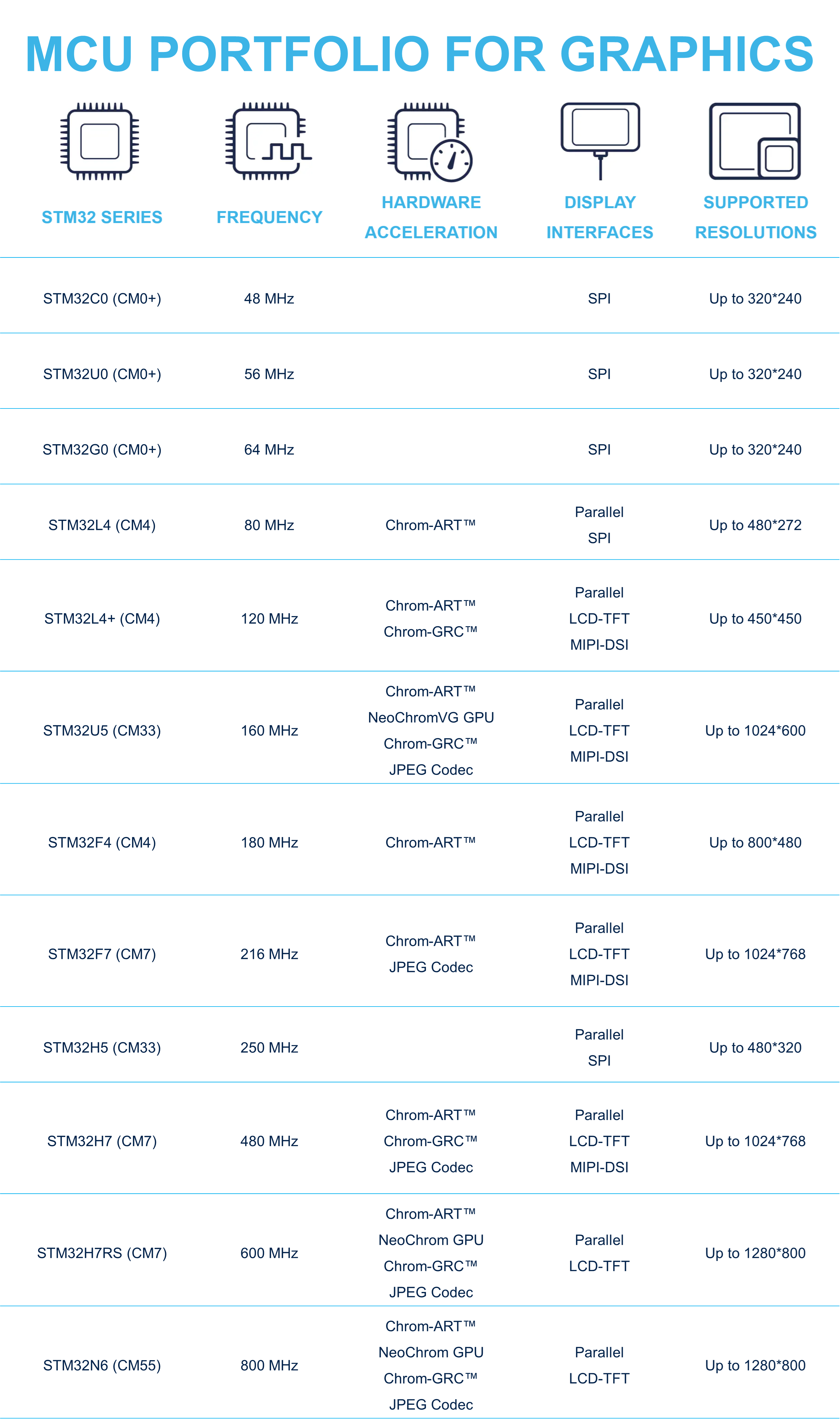 STM32 MCU採用不同的ARC Cortex®-M架構。 下面是STM32上運行圖形時最常用的內核。