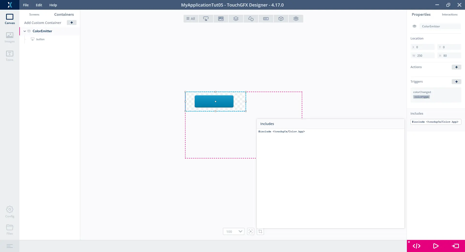 First, let's create a new custom container and call it "ColorEmitter". Insert a button and call it "button". You should have something similar to the image below: