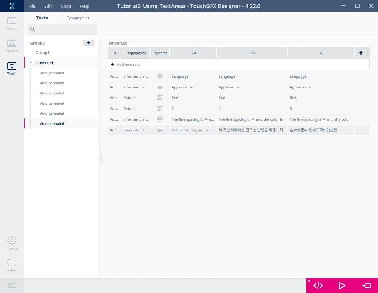 In this example, we decided to add Chinese and Korean to see how TouchGFX Designer behaves when dealing with characters such as those of the Chinese language.