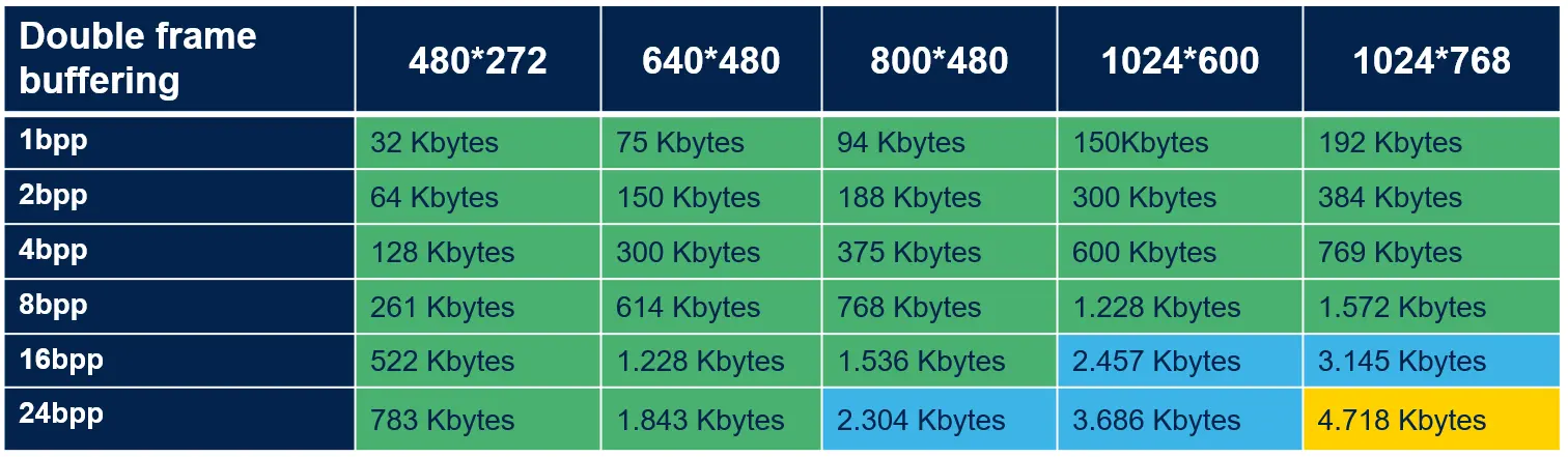 It also provides you with an overview of needed RAM for running double framebuffer setup in 1, 2, 4, 8, 16, and 24 bits per pixel (dividing by 2 gives you the required density for a single framebuffer).