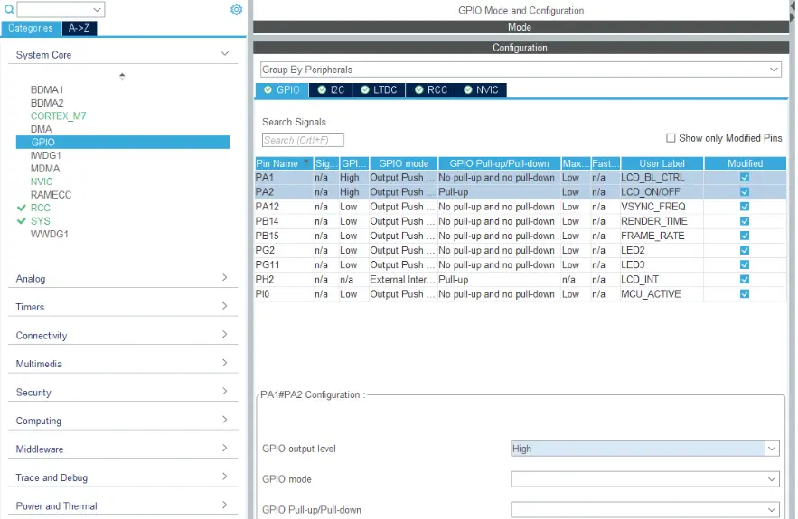 - Navigate to the GPIO settings in the System Core -> GPIO section. Look for the PINs linked to the backlight of the display and set the GPIO output level to HIGH. For the STM32H7B3-DK board the pins are PA1 (User label: LCD_BL_CTRL) and PA2 (User label: LCD_ON/OFF).