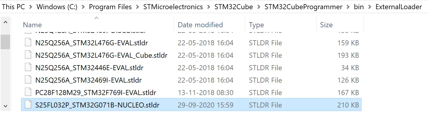 The flash loader is not available in STM32CubeProgrammer initially, so it must be installed by copying the stldr file to the installation: