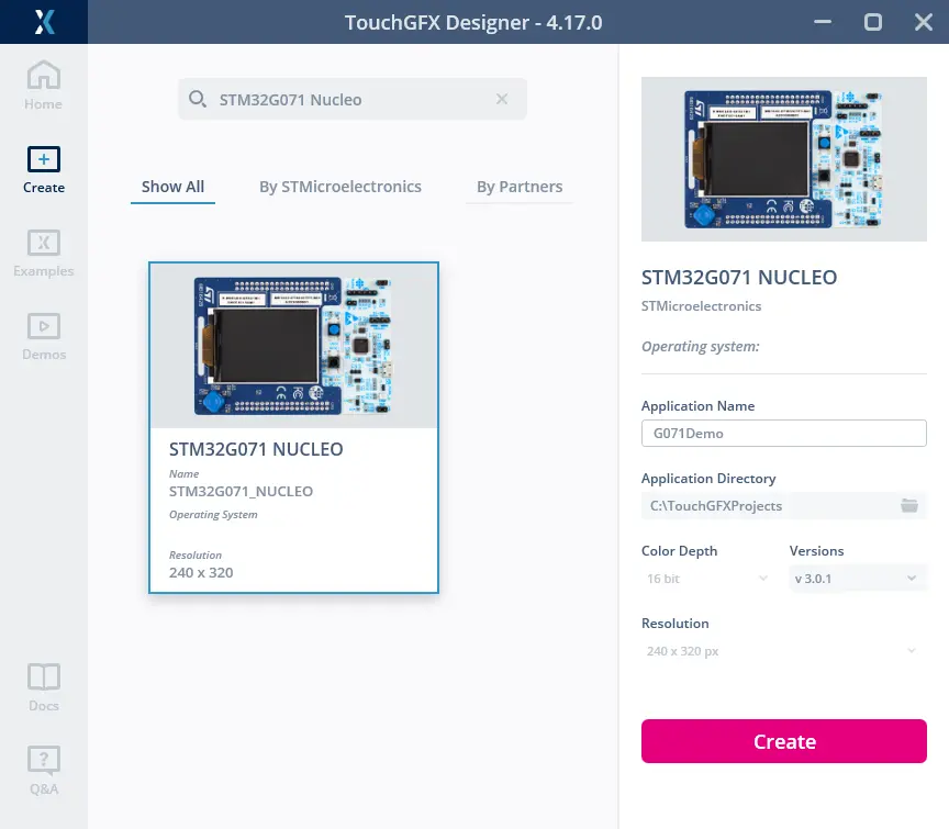 It is easy to start a project for the STM32G071RB Nucleo evaluation kit in TouchGFX Designer. Click on the "Create New" button and search for STM32G071 Nucleo. This board setup is developed specifically for the Nucleo-G071RB kit with the X-Nucleo-GFX01M1 display shield.