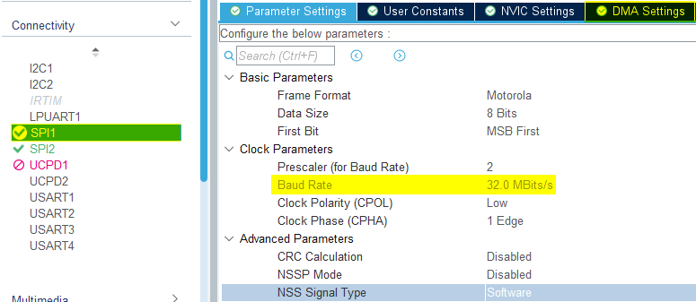 Compared to other display interfaces (e.g., FMC), SPI has a lower bandwidth. It is therefore important to optimize the SPI configuration to highest Baud rate to maximize bandwidth. Enable the SPI from the Connectivity group in the STM32CubeMX category list. It is recommended to configure a DMA channel to the SPI to minimize CPU load. An example below is for a 64MHz MCU, which caps the SPI Baud at 32MBit/s.