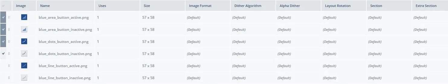 When the value of a cell is grayed out, it means that the default value is used. When an explicit value has been set on an Image, for example changing the default Image Format value to ARGB8888, the cell will darken. The default values can be set within the Config View.