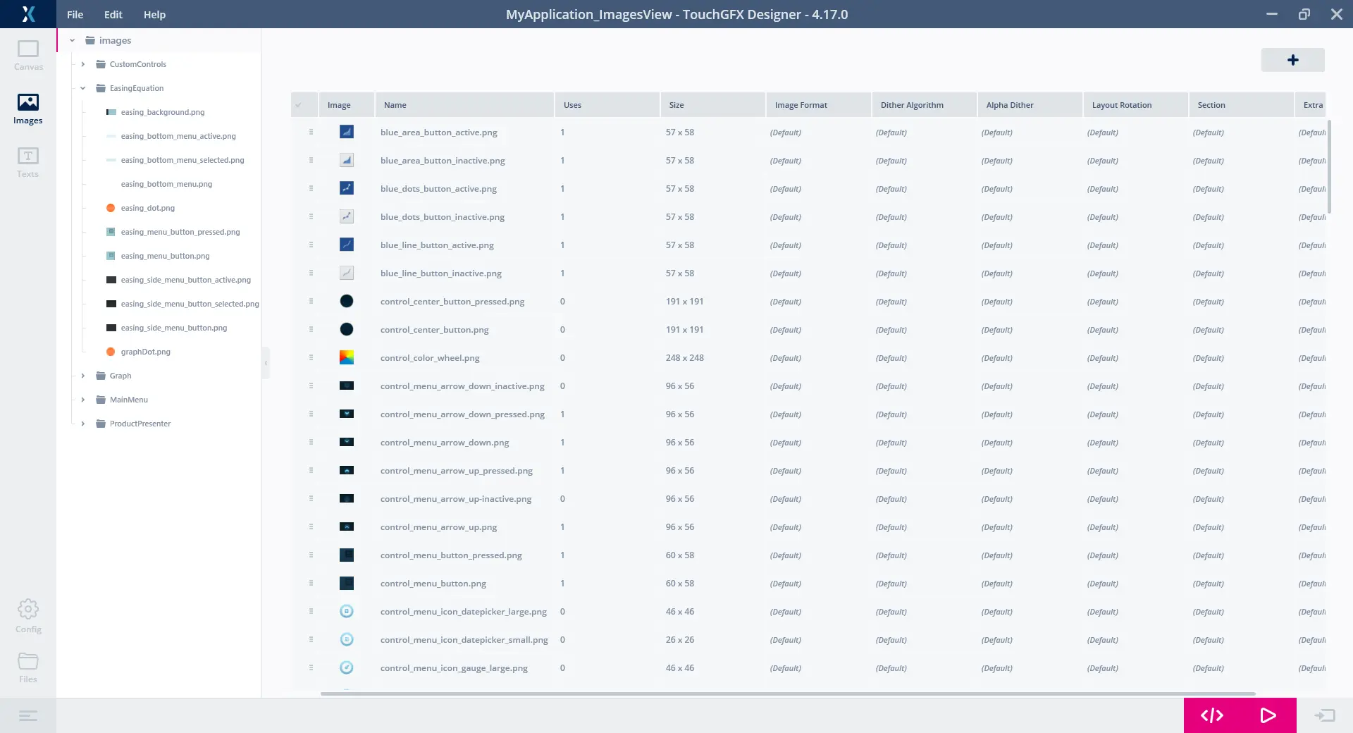 The Images View is used to manage the images used in a TouchGFX application (located under the assets\images