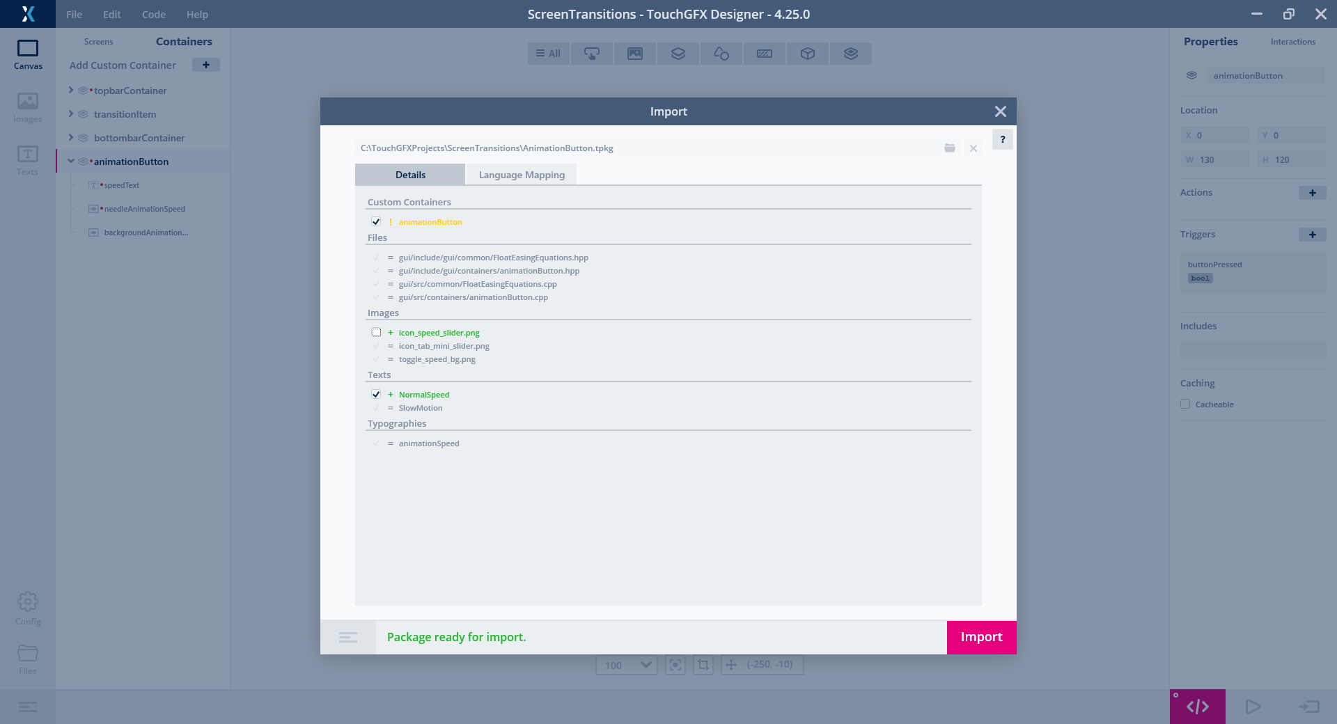 TouchGFX Designer enables the import and export of custom containers. This makes it possible to share and reuse functionality between projects.