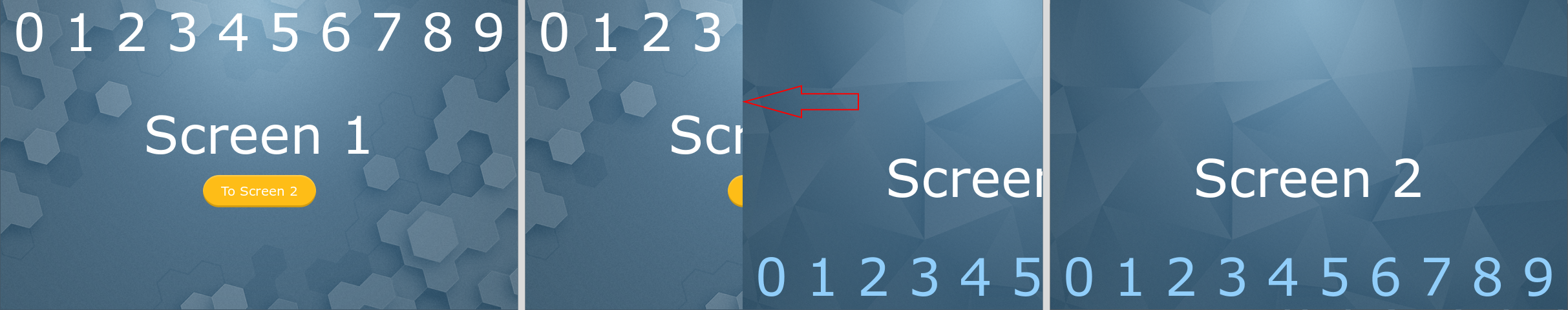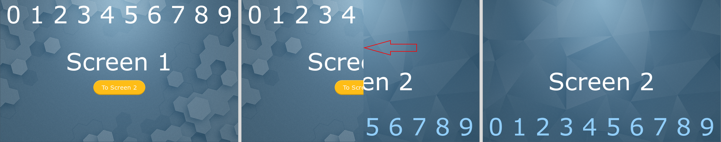 Since the Screen1 is moved out to the left, the numbers 0,1,2,3 in white on Screen1 are not visible in the middle image. The red arrow indicates the incoming edge of Screen2.