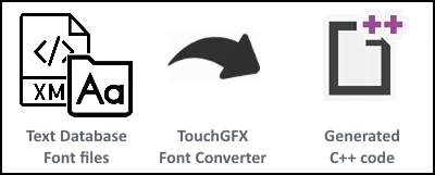 This database, along with font files are fed to the font- and text-converter tools, producing generated C++ code files, that TouchGFX can render.