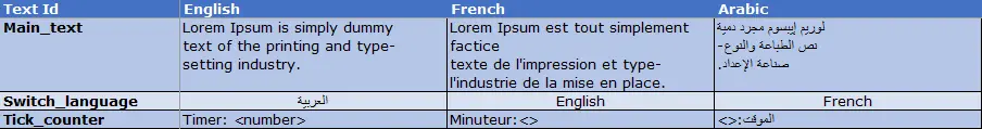 $ translations.rb export assets/texts/texts.xml translations.xlsx English French Arabic