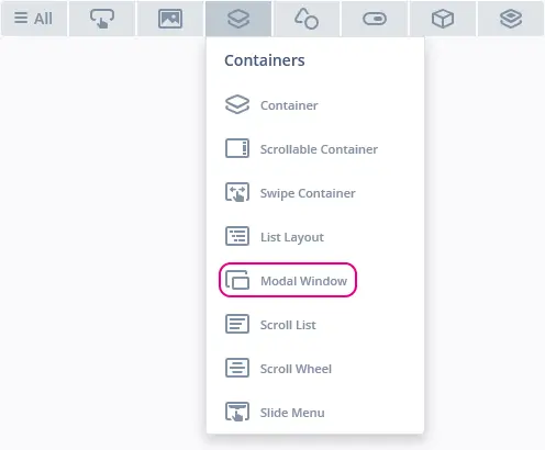 The Modal Window can be found in the Containers widget group in TouchGFX Designer.