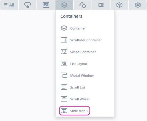 The Slide Menu can be found in the Containers widget group in TouchGFX Designer.