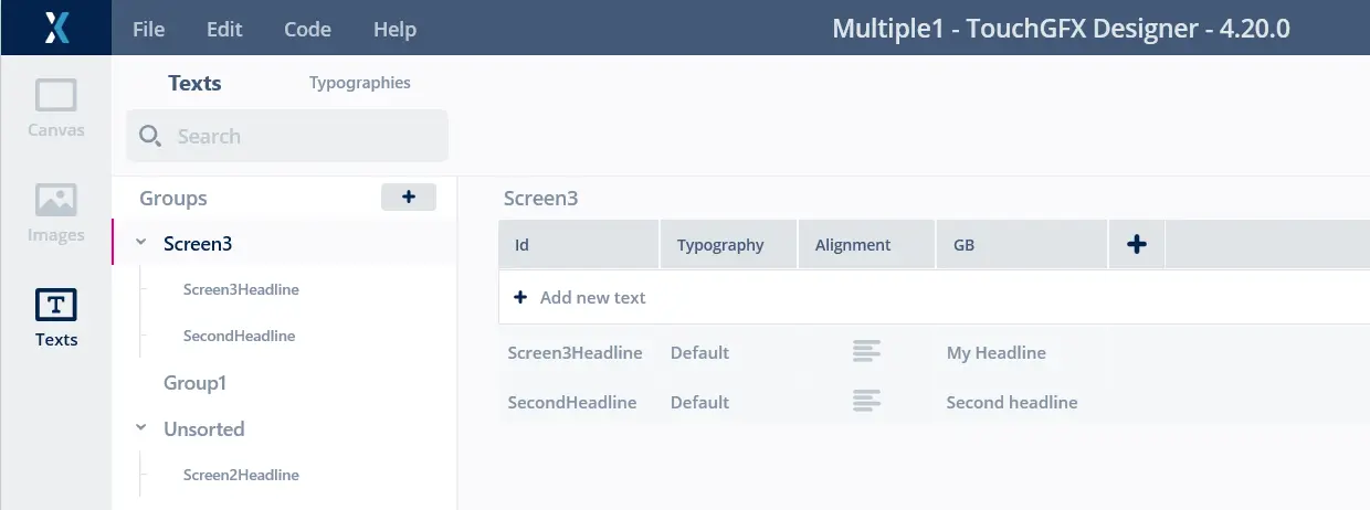Text conflicts can be reduced by using multiple TextGroups instead of putting all texts in the "Unsorted" group. Here we have created a TextGroup for Screen3 and moved the old text to this group and added a new text (SecondHeadline):