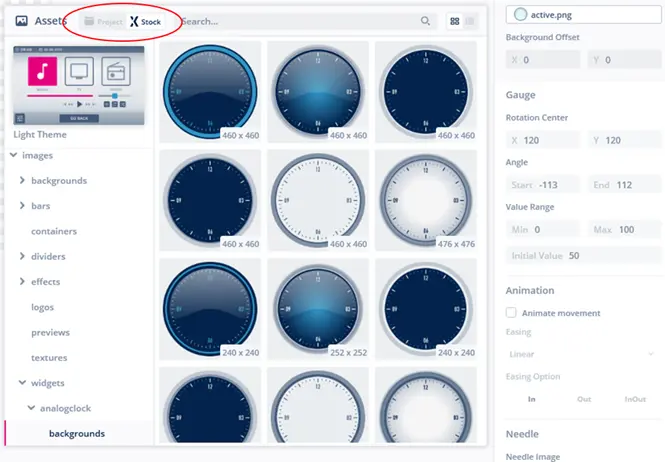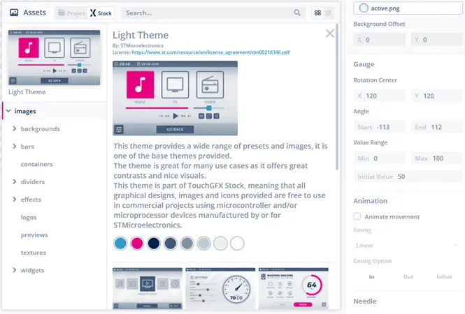 The TouchGFX Stock elements can be browsed when editing image or preset properties of a widget. When browsing, click the currently selected theme to select another theme.