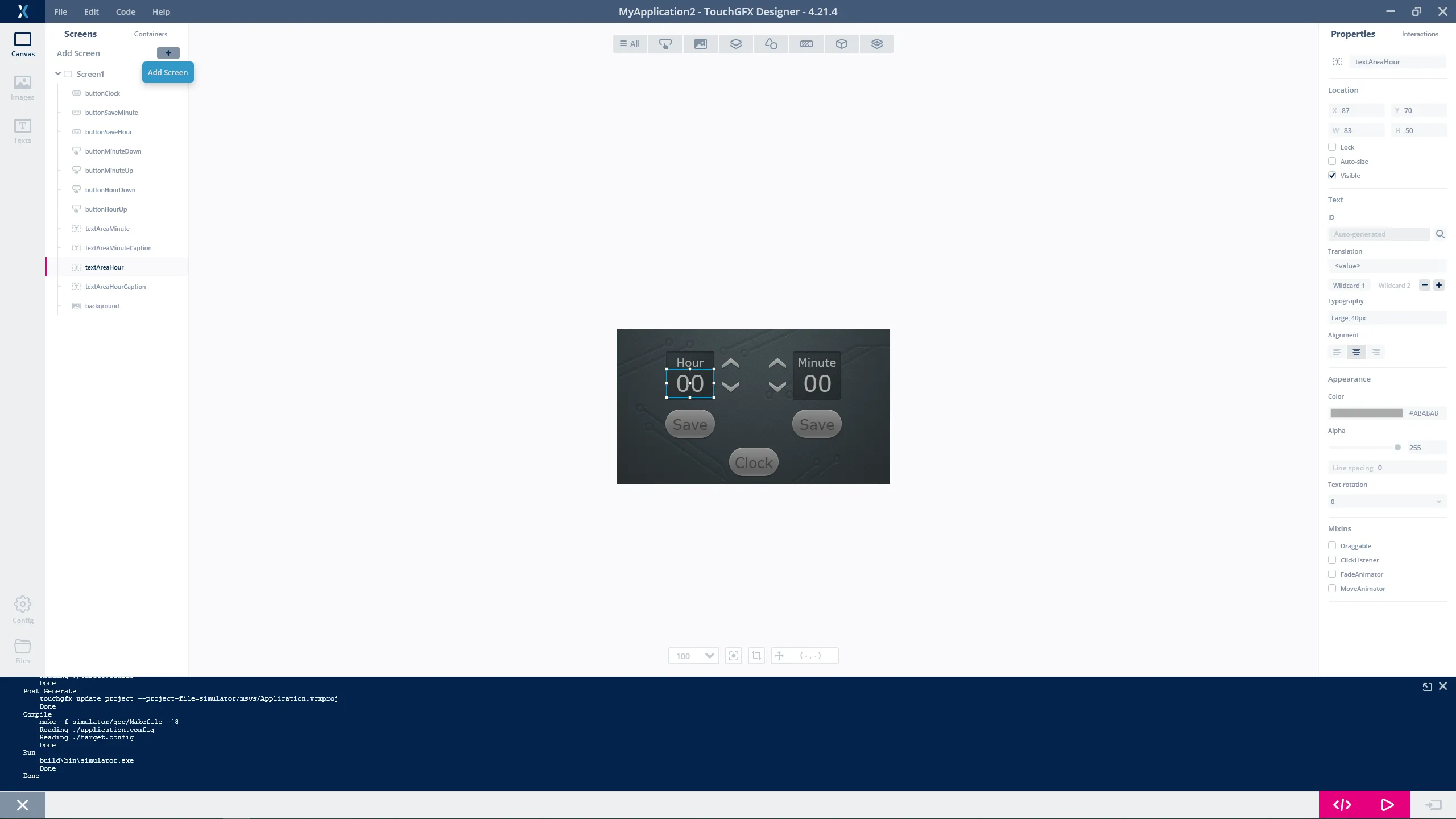 If you press "Generate Code" or "Run Simulator" the specified virtual functions will be generated by TouchGFX Designer. まずは、矢印ボタン用の4つの関数を統合しましょう。 時と分の値をトラッキングするために、2つのカウンタも追加されます。