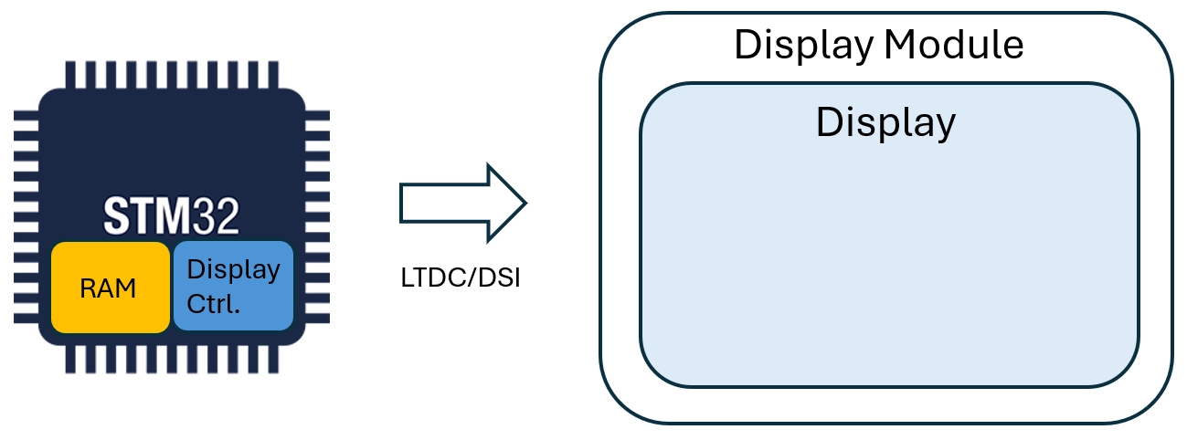 TouchGFXのフレームバッファをディスプレイ内のRAMに配置することは不可能です。ディスプレイのメモリはメモリ・マップドではなく、ランダムなピクセルの読み書きに適するようにできていないからです。 代わりに、TouchGFXはフレームバッファを内部または外部RAMに配置し、これを適切なタイミングでディスプレイのRAMに転送します。