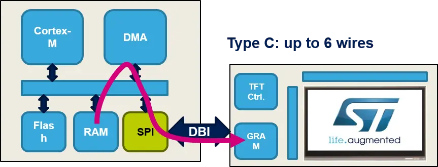 通常、Motorola 6800、Intel 8080、SPI、またはMIPI-DSIインタフェース搭載のディスプレイは、1フルフレームバッファのサイズのRAM(GRAM)を内蔵しています。 これらのタイプのディスプレイは、SPI、FMC、またはDSIホスト(LTDC)を介してマイクロコントローラに接続できます。 2つ目のRAM(フレームバッファ)はディスプレイRAMの外部に設置する必要があり、マイクロコントローラ内や外部RAM内に設置できます。