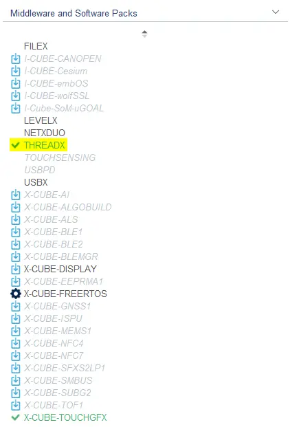 ThreadXを有効にするには、X-CUBEソフトウェア・パックを選択するか、STM32CubeMXからネイティブのThreadXミドルウェアを有効にします(選択したマイクロコントローラ・デバイスで使用可能な場合)。