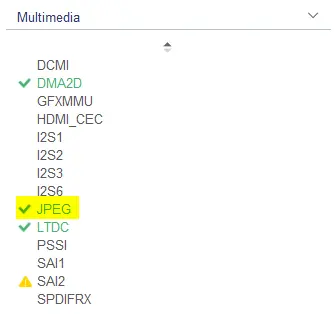 - Software - STM32CubeMXの[Middleware and Software Packs]セクションでLIBJPEGが有効になっている場合は、[Software]オプションを選択すると、ソフトウェア・デコーダが生成されます。 これはつまり、ToughGFX GeneratorによってソフトウェアMJPEGデコーダが生成されるということです。