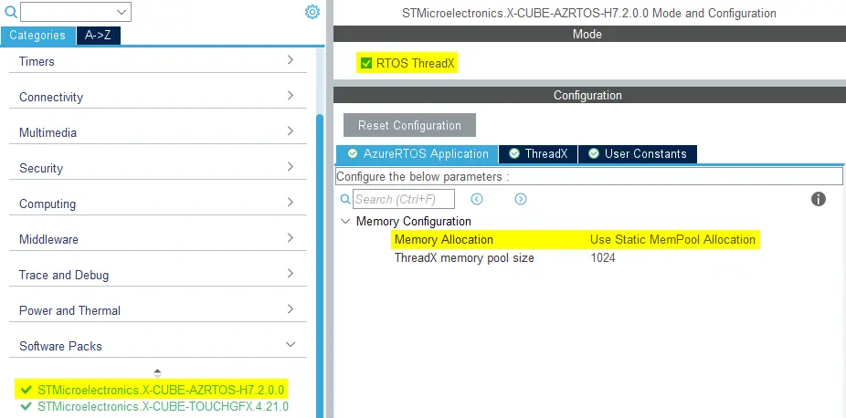 次の例は、STM32H7マイクロコントローラ用にThreadXを設定する方法を示しています。これにより、ThreadXがX-CUBEソフトウェア・パックとして使用できるようになります。