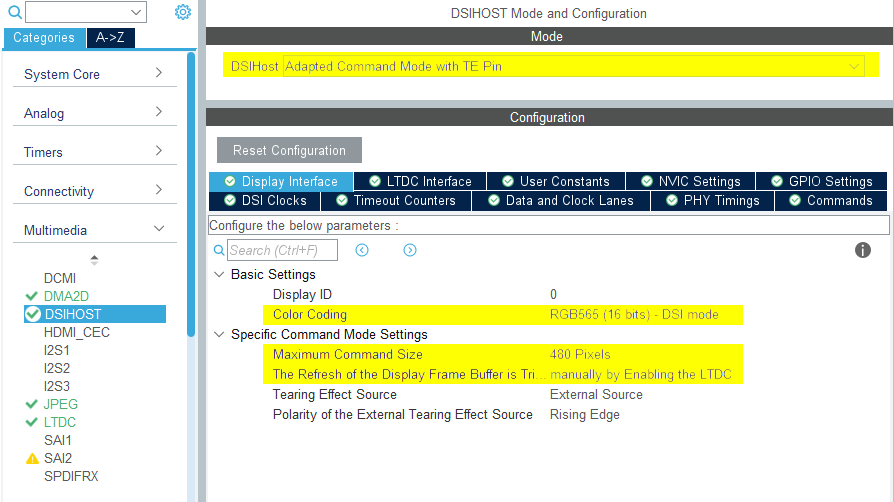 をRGB565(16 bits)- DSI modeに設定Maximum Command Size