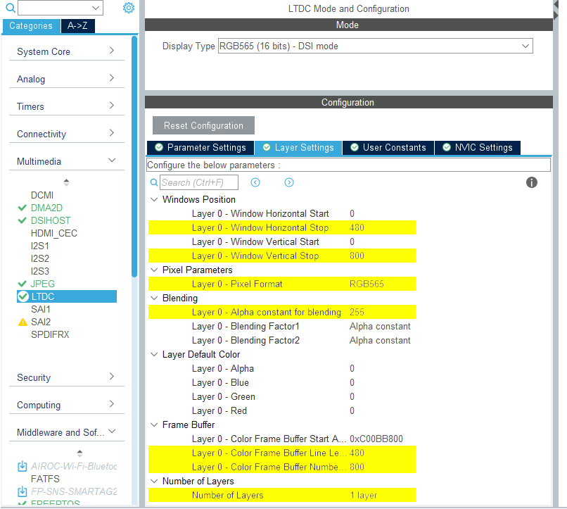 をmanually by Enabling the LTDCに設定- 残りの設定は選択したLCD HWに応じて異なる