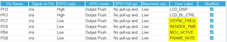 STM32CubeMXを使用して、GPIO出力ピンの設定を簡単にできます。 各ピンにユーザラベルを付けることにより、TouchGFXGPIO.cpp