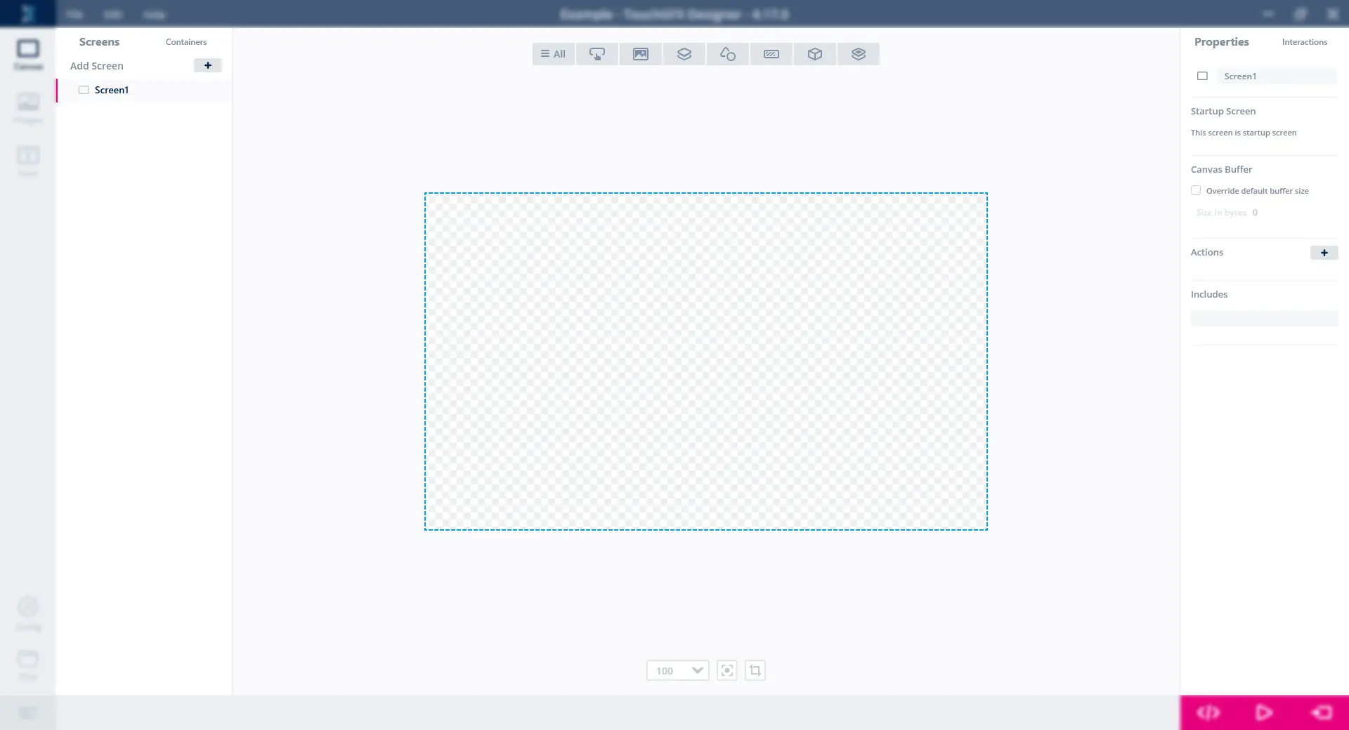ビューの中央にはキャンバスがあり、現在選択中のスクリーンまたはカスタム・コンテナのビューが表示されます。