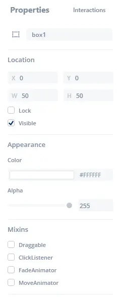 右側のサイド・バーにはタブ・コントロールがあり、現在選択されているウィジェットのPropertiesや、キャンバスに現在表示されているスクリーンまたはカスタム・コンテナのInteractionsに移動できます。