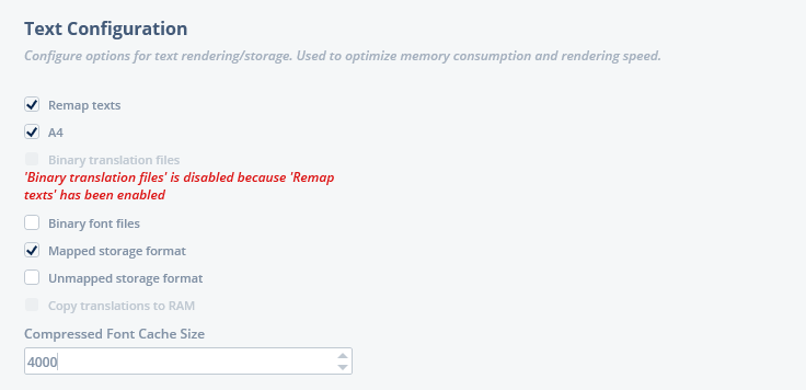 このセクションでは、プロジェクトのニーズに合うチェックボックスをオンにすることで、テキストのレンダリングとストレージを設定できます。