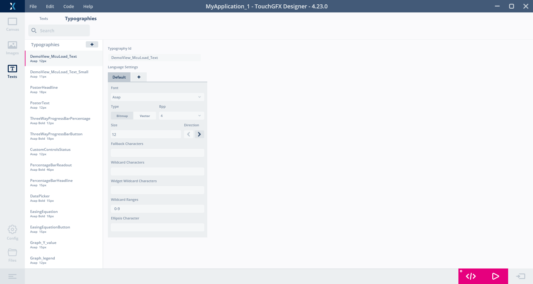 The Texts View in TouchGFX Designer is used for configuring texts, translations and typographies in a project. このビューは、TextsとTypographiesという2つのタブで構成されます。