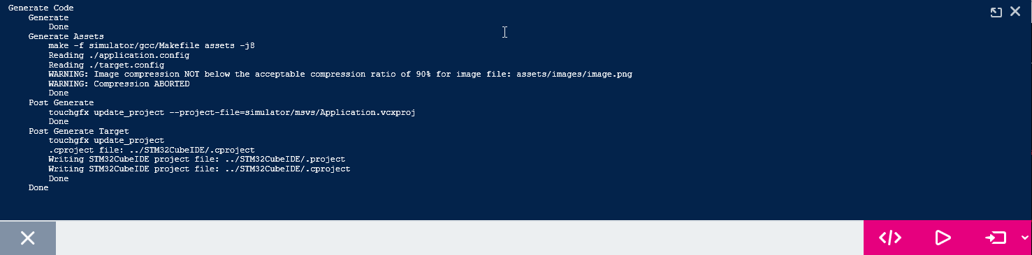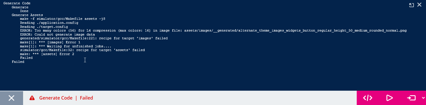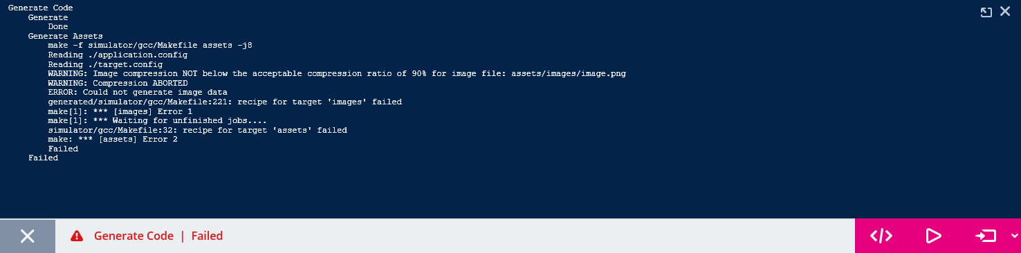 L8画像の場合、これは、指定の画像に適合しないアルゴリズムが選択された場合に発生する可能性があります。 たとえば、画像に17色以上の色が使用されていて、L4圧縮が選択されている場合、選択したアルゴリズムを使用してこの画像を圧縮することはできません。 The Image Converter will print an error message when you generate code, and TouchGFX Designer will show an error message: