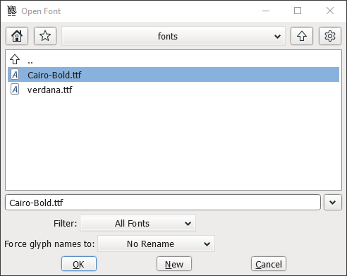 )に移動します。 FontForgeにより、アプリケーション内のすべてのTrueTypeフォントが検出されます。 この例では、Cairo-Bold.ttf TrueTypeフォントに、適切に描画されないオーバーラップしたアウトラインが含まれています。