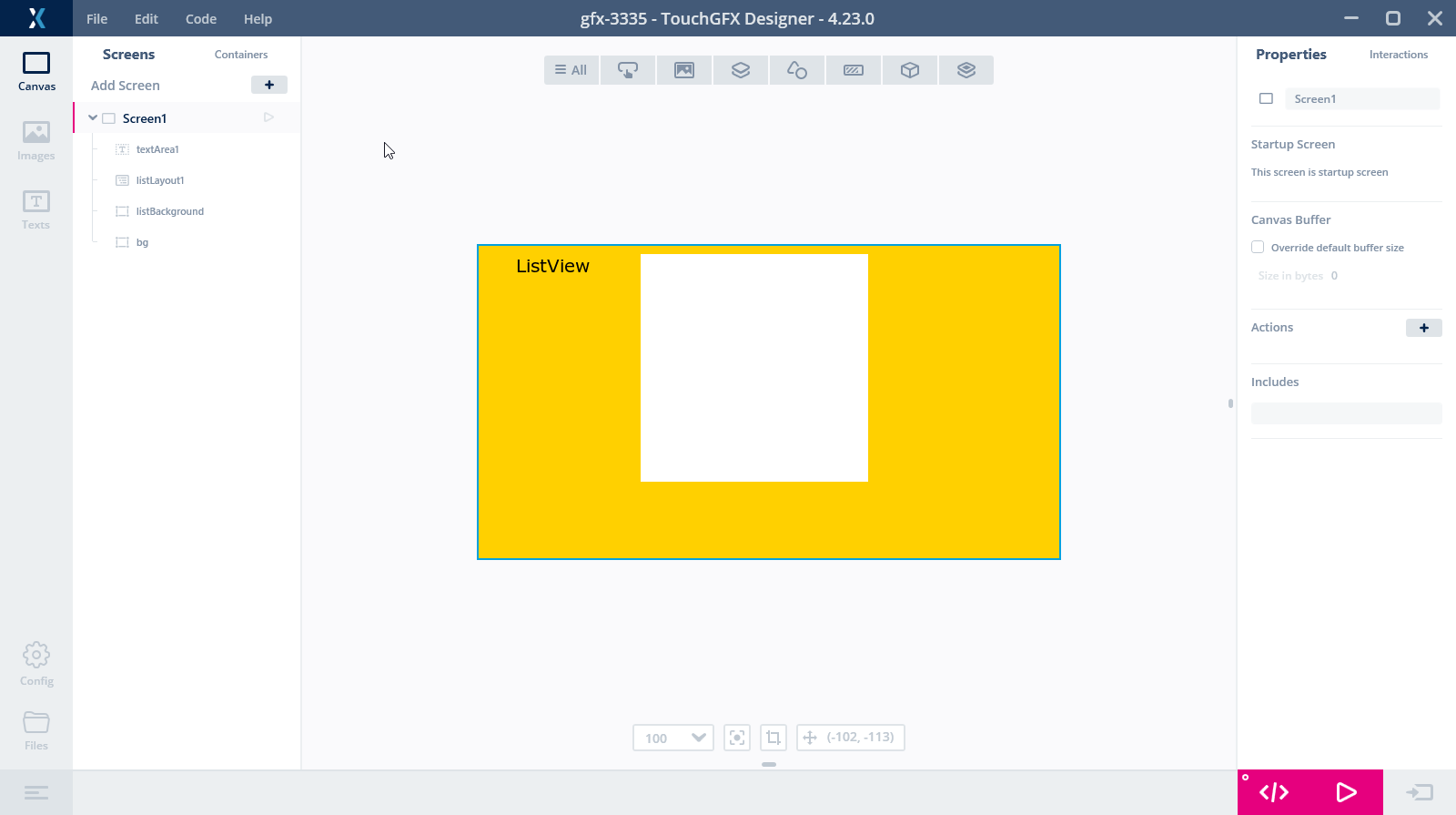 When a List Layout is inserted in TouchGFX Designer, the size is set to 250 x 250 pixels.