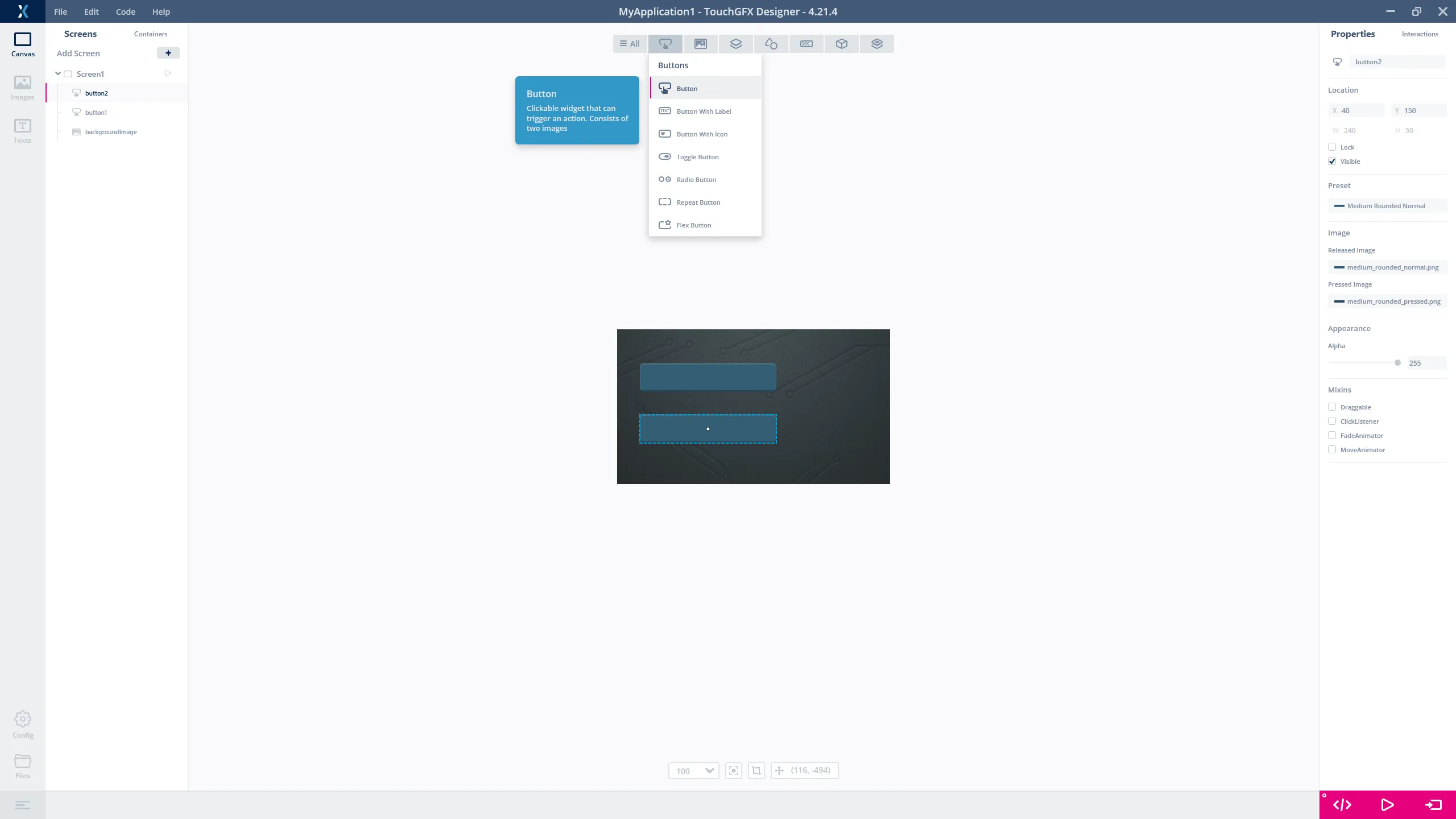 TouchGFX Designer의 캔버스에서 버튼의 형태를 바로 확인할 수 있습니다.