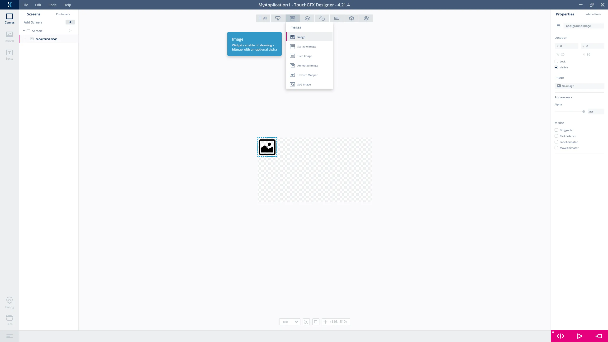 TouchGFX Designer에서 이미지를 사용하려면 먼저 파일을 가져와야 합니다. TouchGFX는 BMP 및 PNG 이미지를 지원합니다(TouchGFX Designer를 통해서는 PNG 이미지를 가져올 수만 있음). PNG 파일이 용량이 더 작고 투명 픽셀을 지원하므로 BMP 파일보다 선호도가 높습니다.