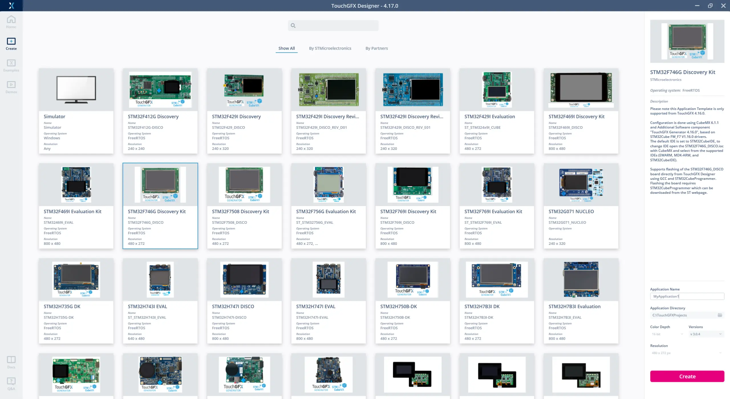 TouchGFX Designer에서 새 프로젝트를 시작합니다. 프로젝트 이름을 "MyApplication1"로 지정하겠습니다. 이 프로젝트는 "STM32F746G Discovery Kit"를 기반으로 합니다.