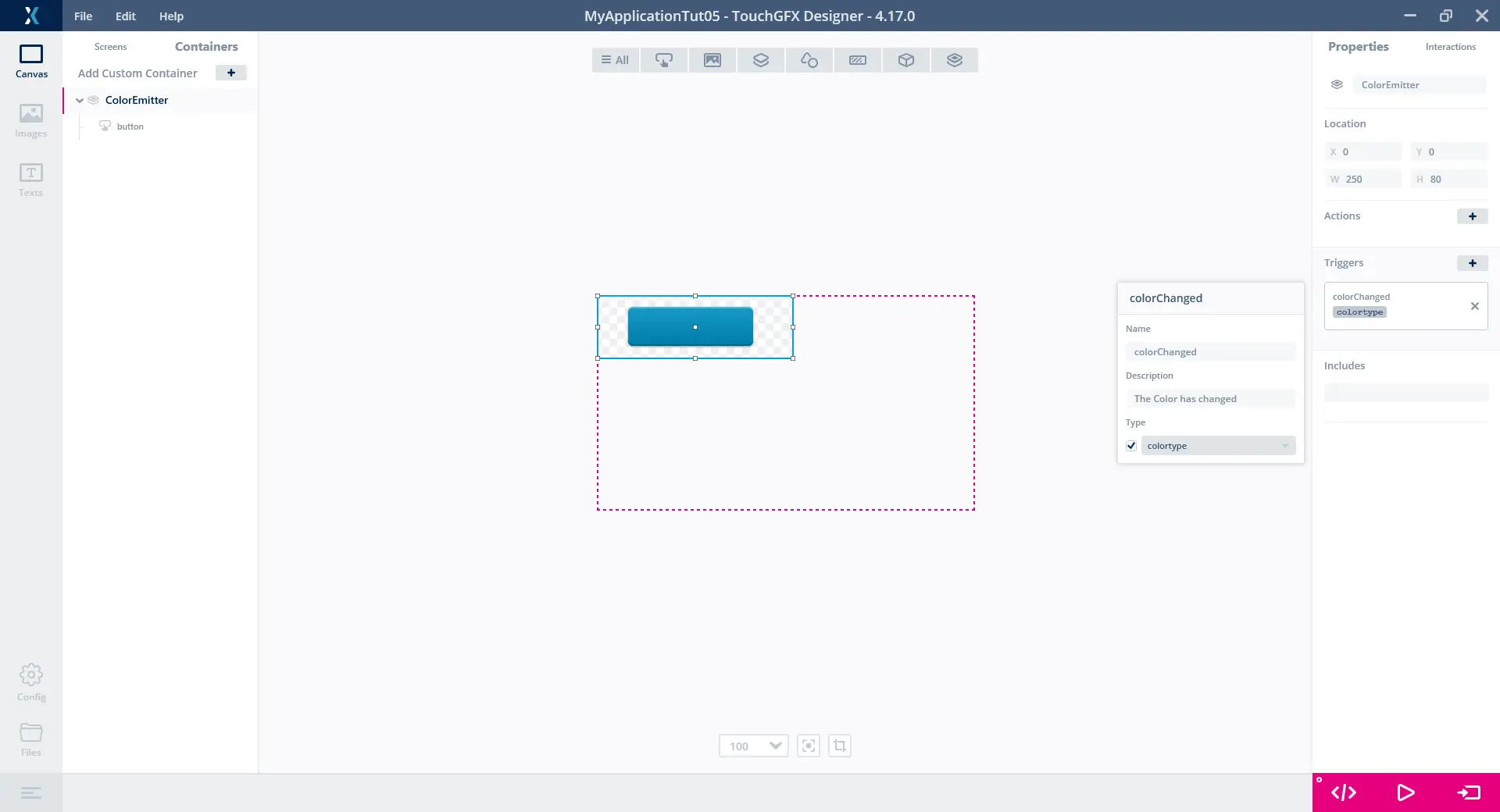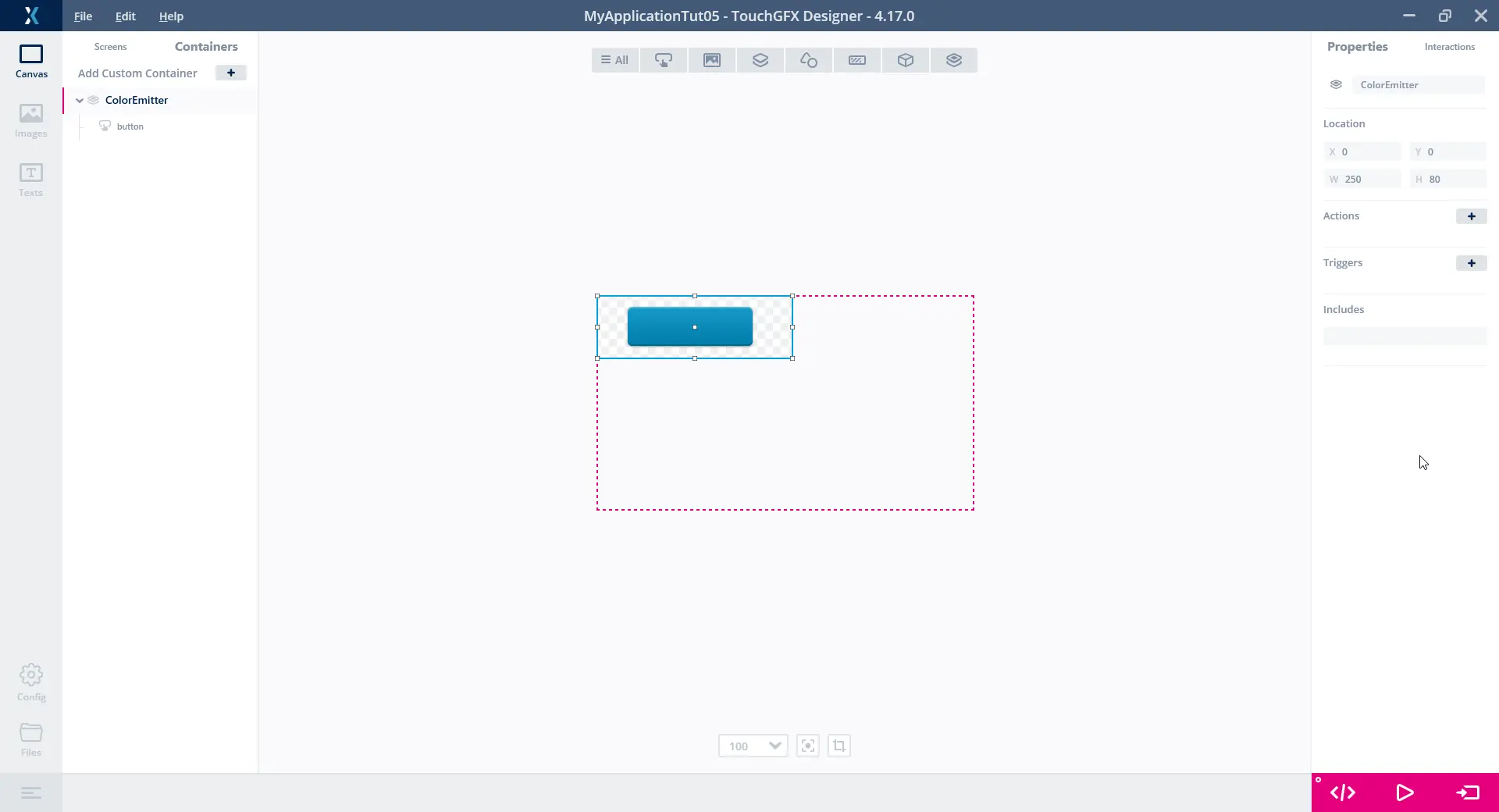 먼저 새로운 커스텀 컨테이너를 생성한 후 이름을 "ColorEmitter"라고 지정합니다. 버튼을 삽입하고 이름을 "button"이라고 지정합니다. 그러면 아래 이미지와 비슷한 모습이 될 것입니다.