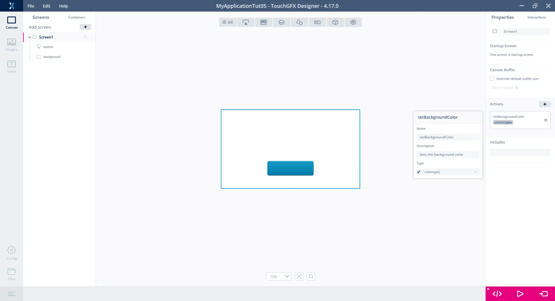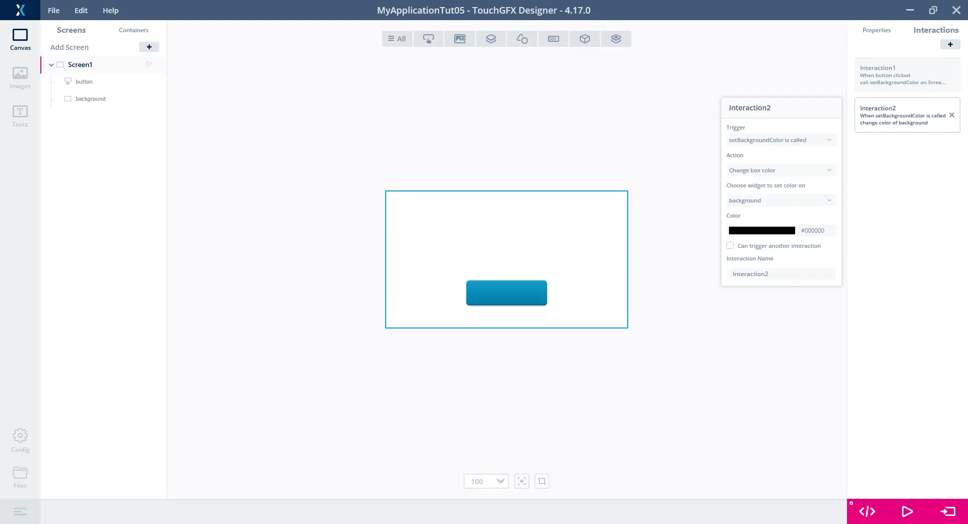 파일의 사용자 코드에서 메소드를 재정의하거나 TouchGFX Designer를 통해 인터랙션을 생성하는 방법으로 이 메소드에 기능을 추가할 수 있습니다. 후자의 방법으로 화면의 Interactions 탭으로 이동하여 버튼을 클릭할 때 새로운 메소드를 호출하는 인터랙션을 추가해보겠습니다.