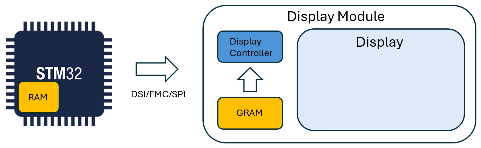 시스템의 디스플레이 유형에 따라 디스플레이에 메모리가 내장되어 있을 수 있습니다(종종 GRAM이라 칭함). 이러한 메모리에는 디스플레이의 “물리적” 픽셀 내용이 저장됩니다. 픽셀 메모리가 디스플레이에 내장된다는 것은 디스플레이가 작동 중일 때도 MCU가 유휴 상태가 될 수 있다는 것을 의미합니다.