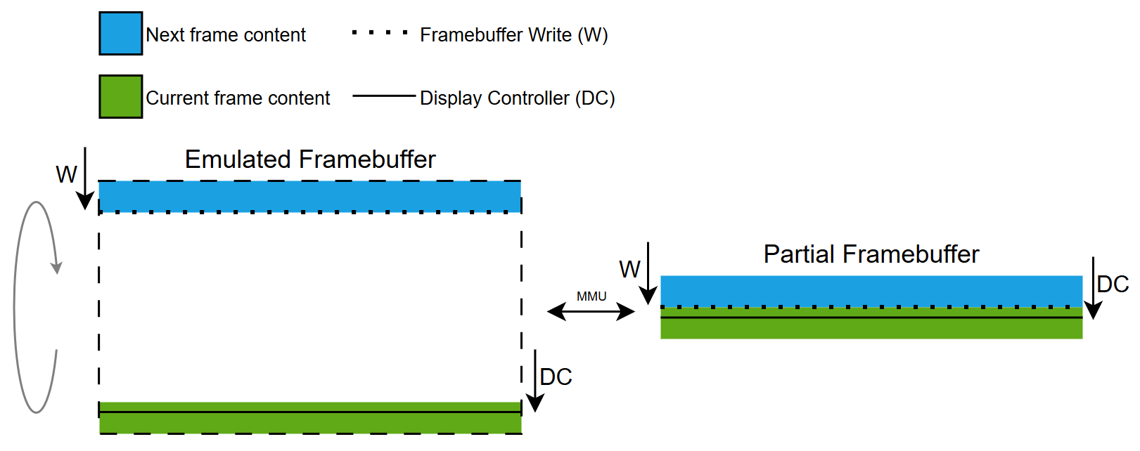 단일 부분 프레임버퍼 블록은 메모리 관리 장치(MMU)를 통해 전체 크기의 프레임버퍼를 에뮬레이션하는 데 사용됩니다. 따라서 이 전략은 에뮬레이션 프레임버퍼 전략으로도 알려져 있습니다.