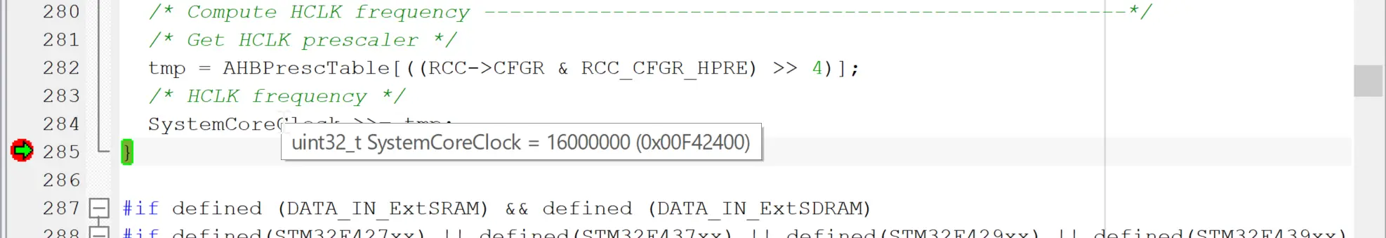 함수 마지막에 중단점을 설정한 경우에는 구성에 따라 코어 클록을 확인할 수 있습니다.