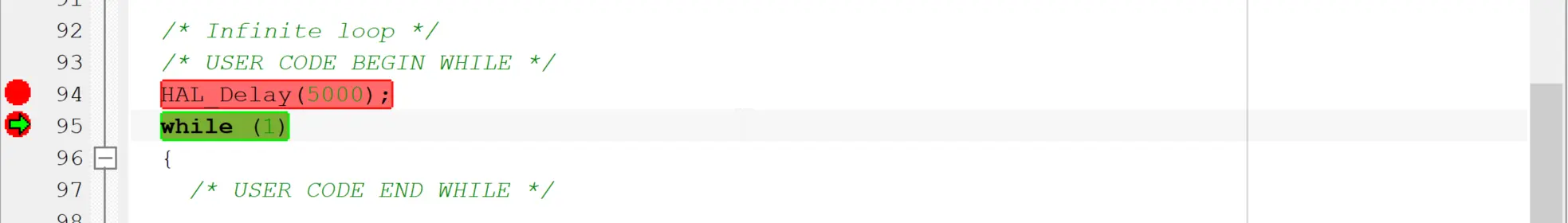 생성된 코드를 통해 코어 클록(HCLK) 을 런타임 시 계산해서 변수에 저장할 수 있습니다. 이 변수는 클록 사이클과 초(예: 시작 타이머) 간의 올바른 전환을 위해 애플리케이션 코드에서 사용됩니다. 변수를 다시 계산하려면 SystemCoreClockUpdate() 함수를 호출해야 합니다. 사용자 코드 섹션에서 main.c에 호출을 삽입합니다.