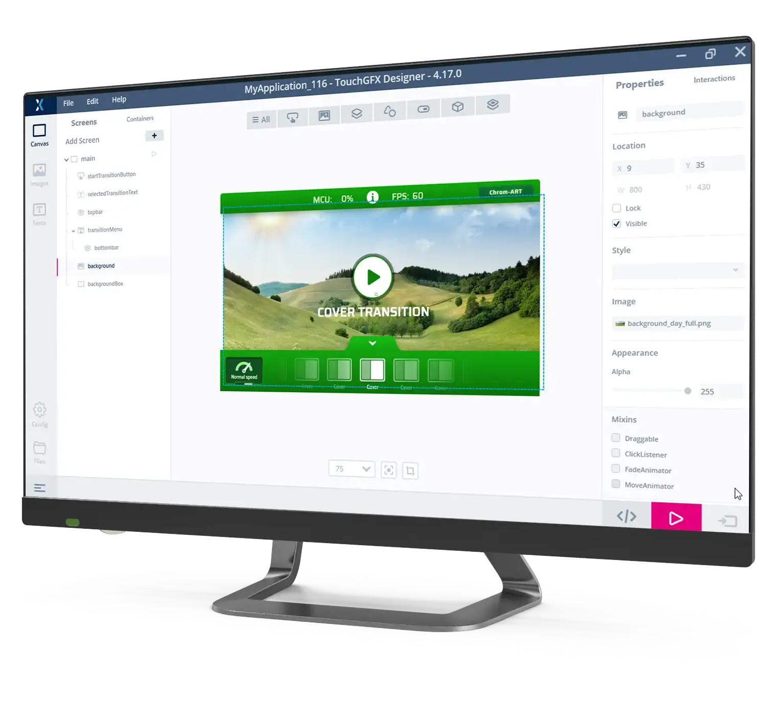 TouchGFX Designer와 개발자가 즐겨 사용하는 IDE 또는 텍스트 편집기가 이 활동의 주요 도구입니다. TouchGFX Designer에서 애플리케이션의 화면을 설정, 디자인 및 생성하고 TouchGFX UI Application의 주요 부분을 C++ 코드로 작성합니다. 애플리케이션 로직(이벤트 처리, 시스템에서 UI가 아닌 부분과의 통신)에서 IDE 또는 텍스트 편집기를 사용해 TouchGFX Designer에서 생성된 코드와 공존 및 상호 작용하는 C++ 코드를 작성하게 됩니다.