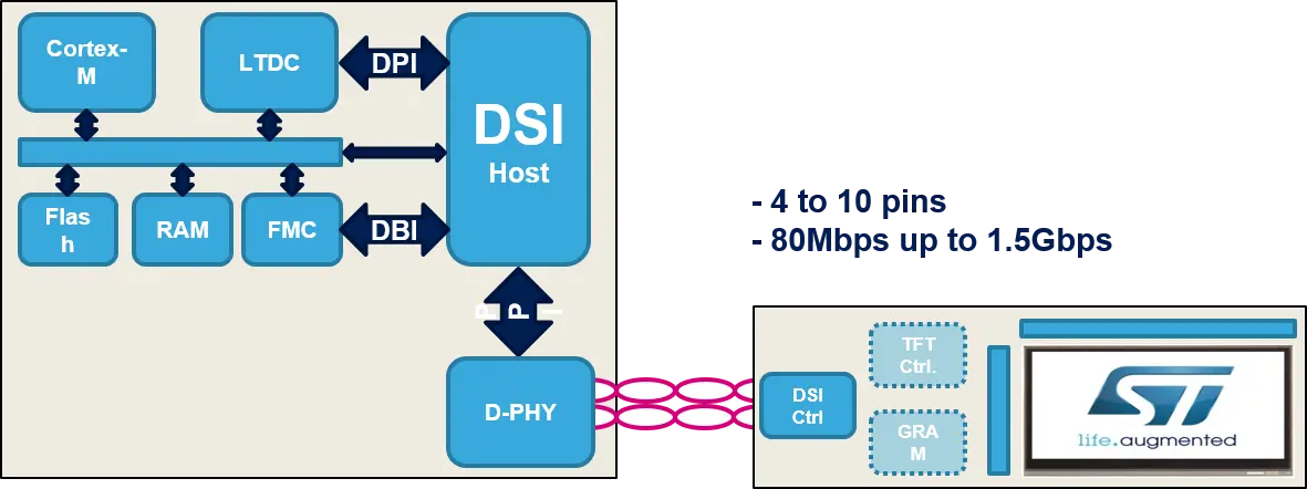 Motorla 6800, Intel 8080, SPI 또는 MIPI-DSI 인터페이스가 포함된 디스플레이에는 보통 하나의 전체 프레임 버퍼의 크기를 가지는 RAM(GRAM)이 내장되어 있습니다. 이러한 유형의 디스플레이는 SPI, FMC 또는 DSI-호스트(LTDC)를 통해 MCU에 연결할 수 있습니다. 두 번째 RAM(프레임 버퍼)은 디스플레이 RAM 외부에 있어야 합니다(MCU 또는 외부 RAM).