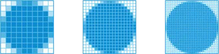 픽셀 밀도가 너무 낮으면 계단 효과가 나타날 수 있습니다. 애플리케이션에서 안티 앨리어싱을 사용하면 이미지에서 이러한 계단 효과가 나타나는 가장자리를 매끄럽게 할 수 있습니다. 처음 두 개의 파란색 원을 보면 계단 효과가 나타난 것을 알 수 있는데, 이는 픽셀 밀도로 인해 디스플레이에서 픽셀을 충분히 표현할 수 없기 때문에 안티 앨리어싱을 충분히 적용할 만큼 색상 범위를 폭넓게 적용하지 못하기 때문입니다.