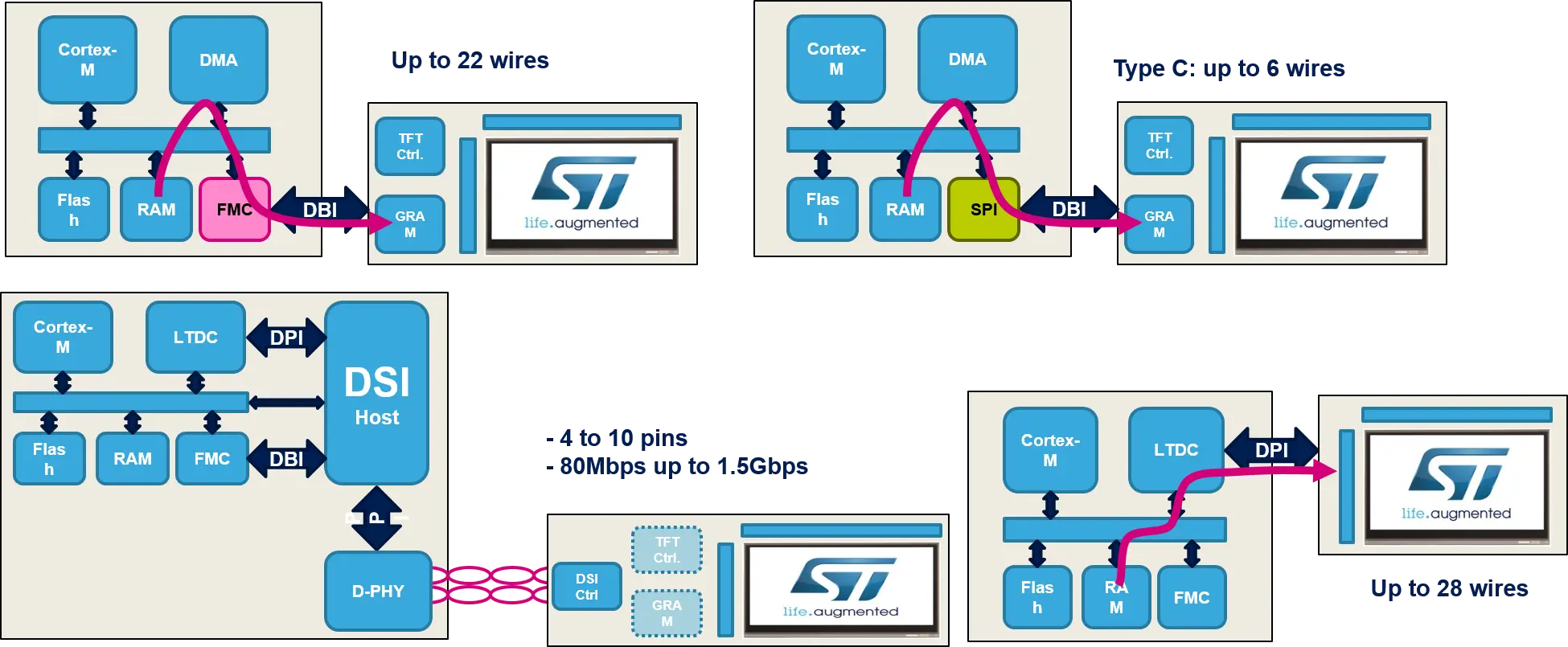 고해상도 디스플레이(WQVGA 이상)에는 컨트롤러와 GRAM이 주로 내장되지 않기 때문에 마이크로컨트롤러 쪽에 컨트롤러가 설치되어야 합니다. RGB-TFT 및 MIPI DSI 인터페이스가 내장된 STM32 MCU에는 컨트롤러가 존재합니다.