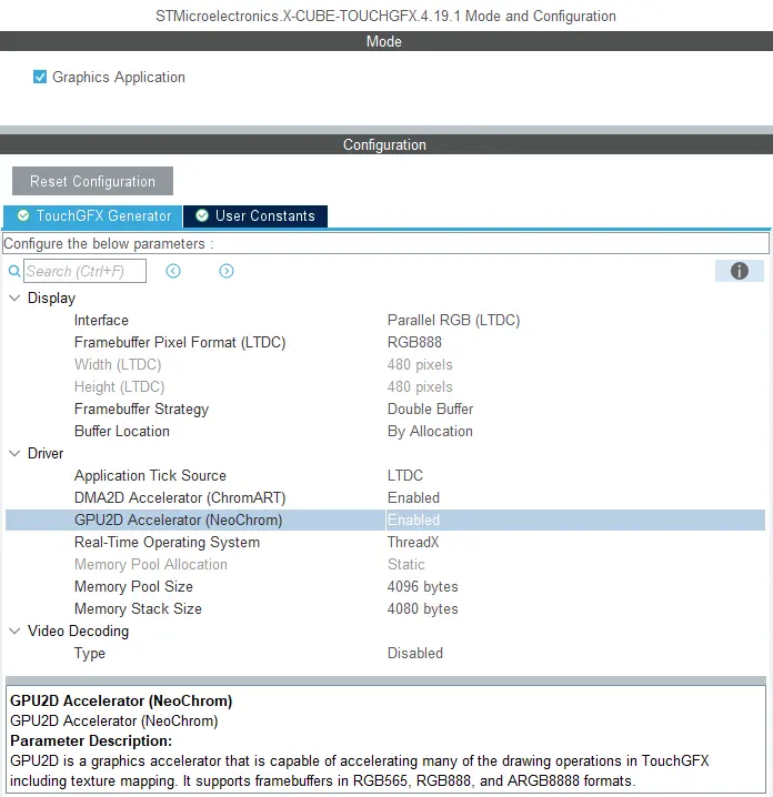 CubeMX 및 TouchGFX Generator는 NeoChrom을 지원합니다. In STM32CubeMX the accelerator is known by its code name GPU2D. The GPU2D accelerator is only available to TouchGFX if GPU2D is enabled in the TouchGFX configuration in STM32CubeMX. TouchGFX Designer와 함께 제공되는 TouchGFX TBS(템플릿 프로젝트)를 사용하는 경우에는 이미 활성화되어 있습니다. 자체적인 커스텀 프로젝트를 만드는 경우, 아래에서와 같이 GPU2D Accelerator를 활성화해야 합니다.