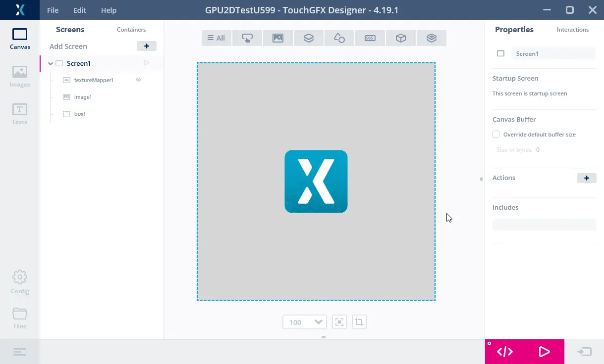 After enabling GPU2D press "Generate Code" in STM32CubeMX. 이렇게 하면 대상 구성 코드가 재생성됩니다. 이제 TouchGFX Designer에서 해당 프로젝트를 열고, 거기에서도 코드를 생성합니다(F4).