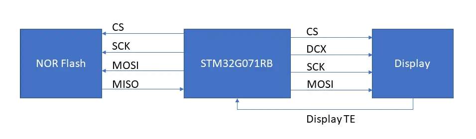 디스플레이는 SPI1 주변 장치에 연결되고, 플래시는 SPI2 주변 장치에 연결되어 있습니다. 따라서 MCU는 데이터를 디스플레이로 전송하는 동안 플래시에서 데이터를 읽을 수 있습니다.